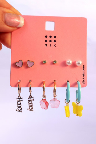 پک گوشواره اورجینال دخترانه شش جفتی میخی و آویز. قلب نگین مروارید پروانه گل تکست هانی
