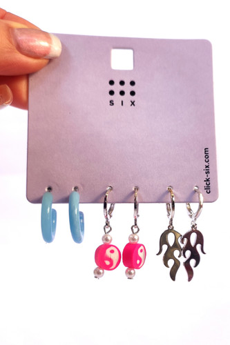 پک گوشواره اورجینال دخترانه سه جفتی آویز و حلقه شعله فلزی و رنگی