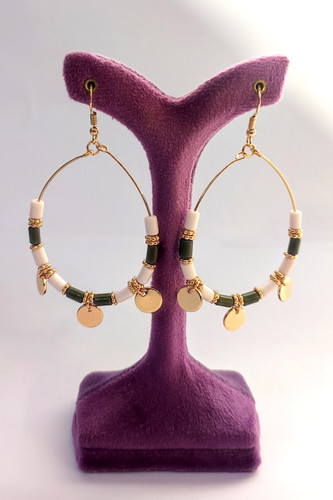 ست گوشواره و دو انگشتر اورجینال رنگ طلایی و کرم و سبز شطرنجی