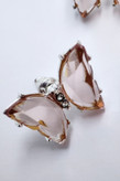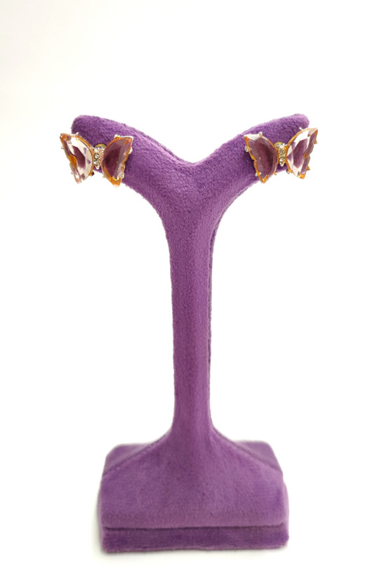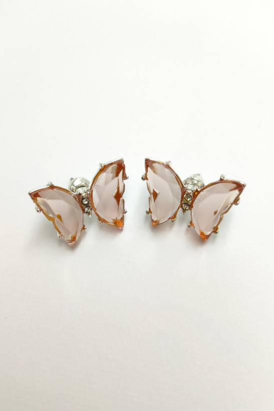 طراحی این گوشواره شامل بالهای نگیندار شفاف است که درخشش لطیفی ایجاد میکند. در مرکز پروانه نیز دو نگین ریز براق کار شده که زیبایی آن را چند برابر میکند.