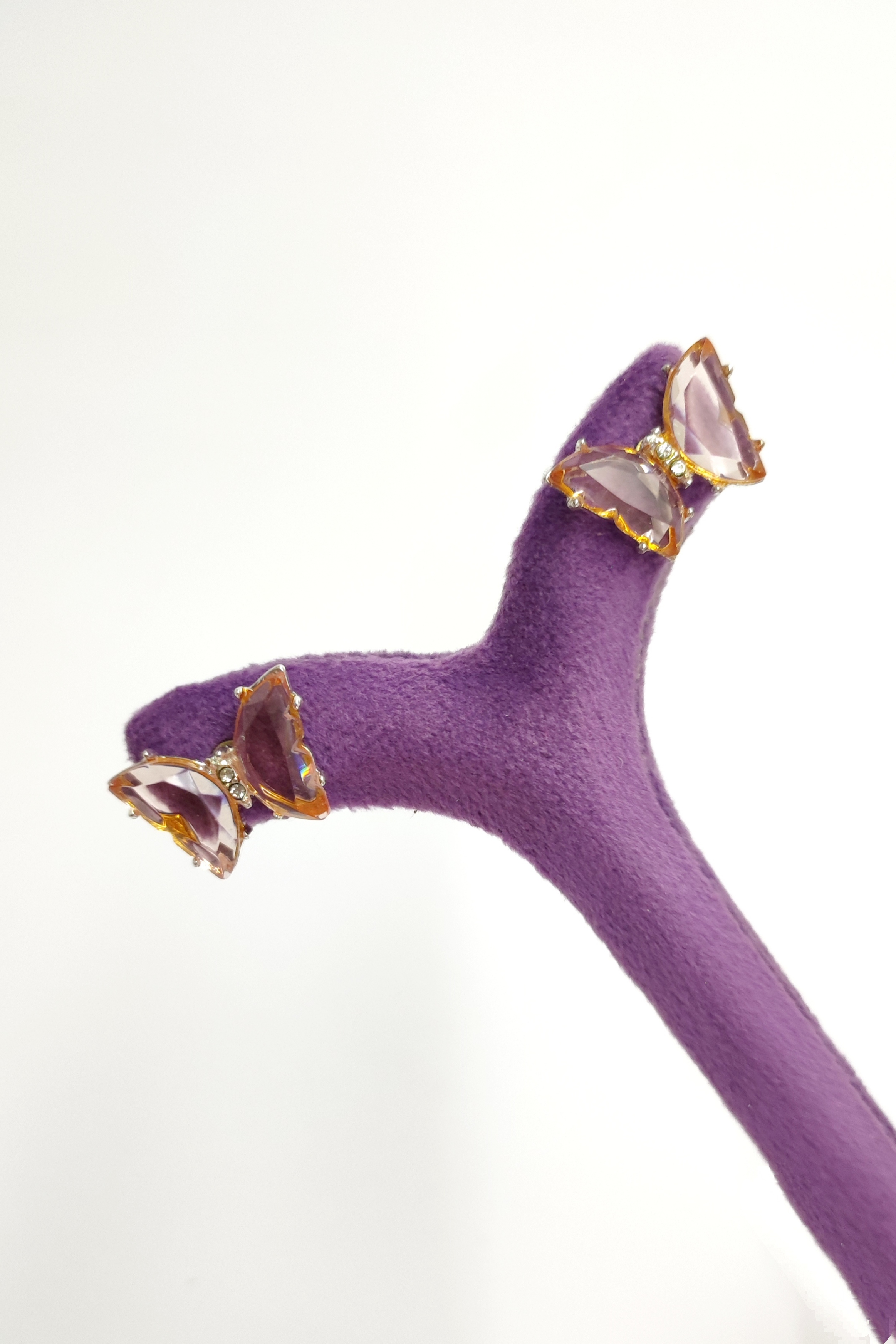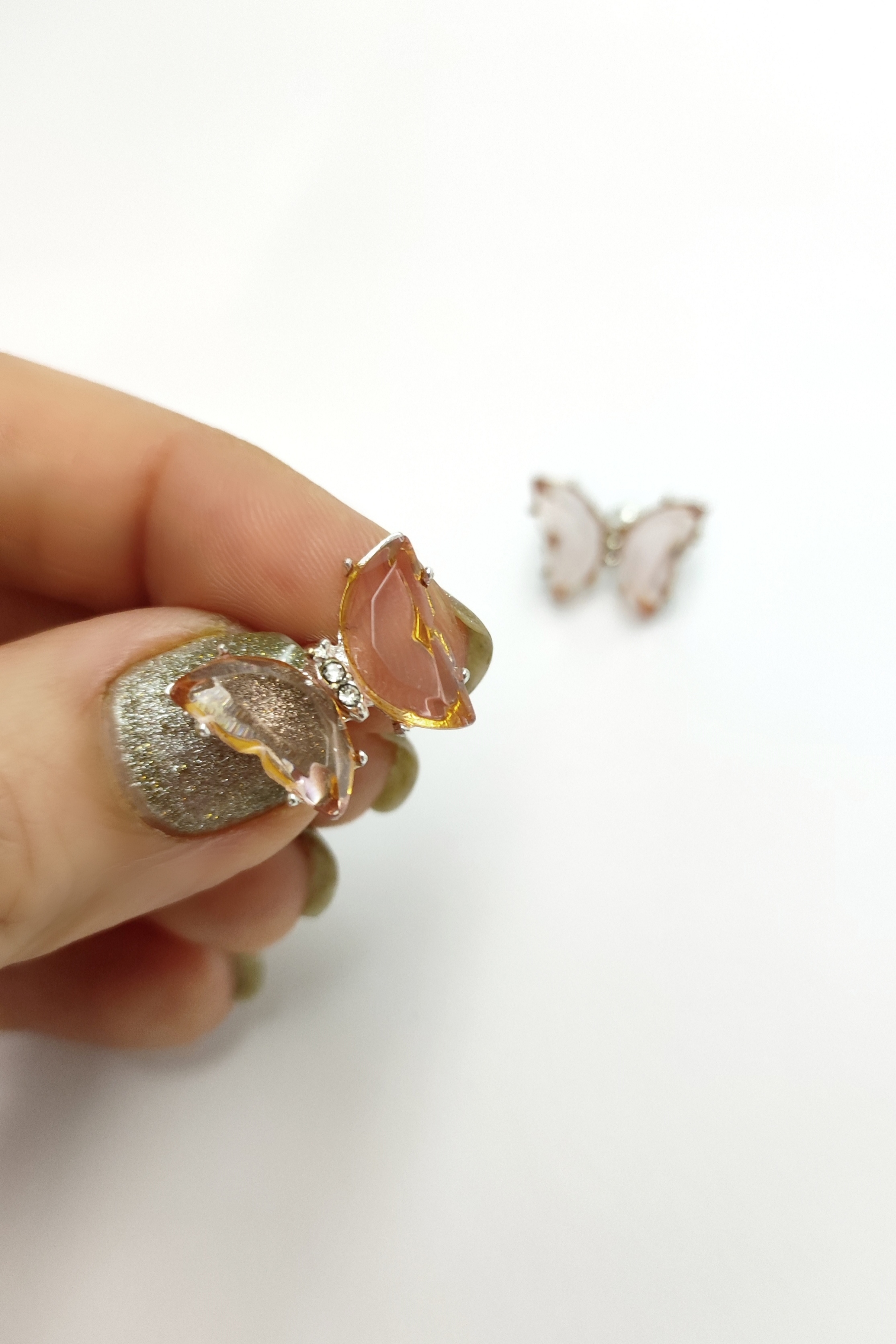 طراحی این گوشواره شامل بالهای نگیندار شفاف است که درخشش لطیفی ایجاد میکند. در مرکز پروانه نیز دو نگین ریز براق کار شده که زیبایی آن را چند برابر میکند.