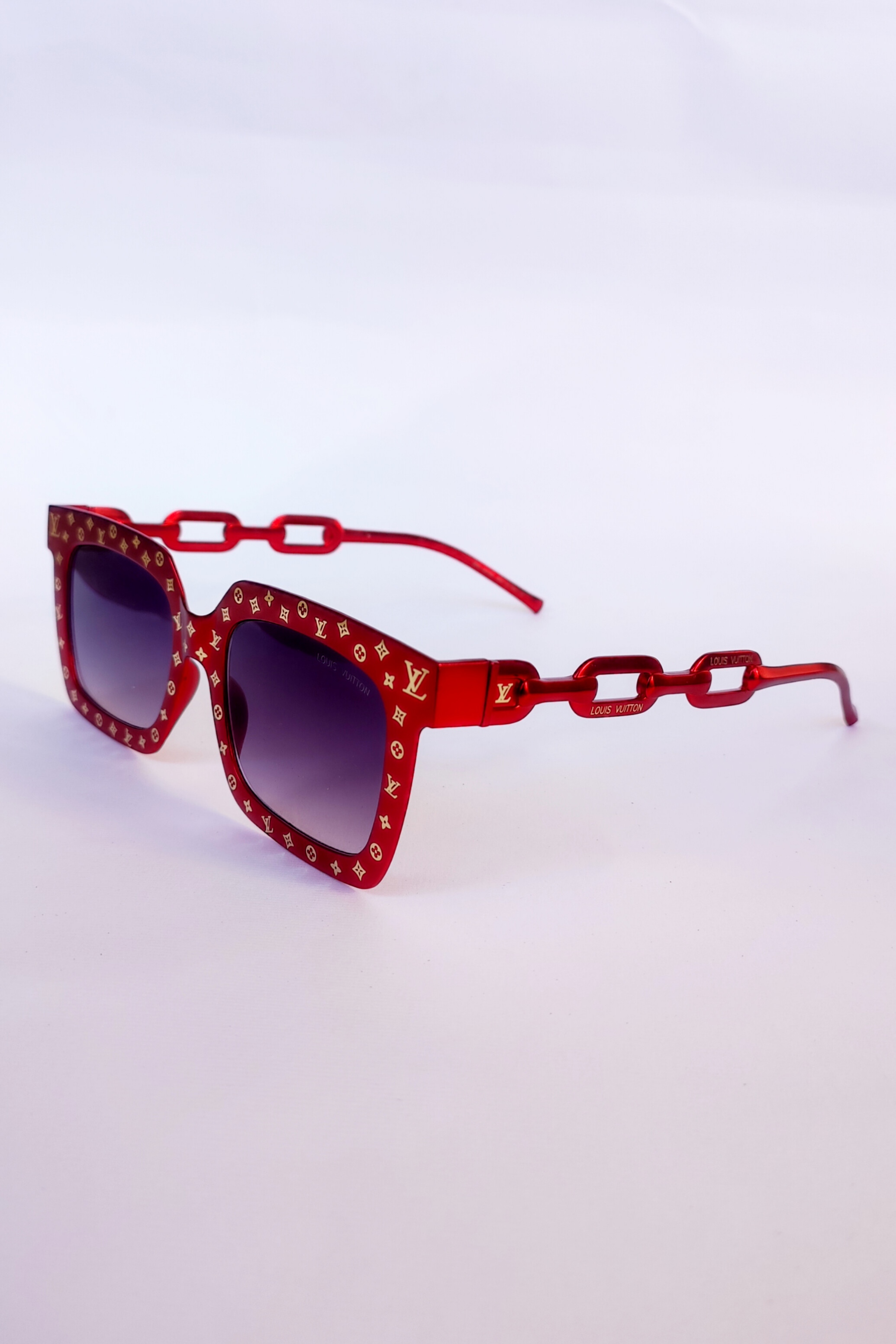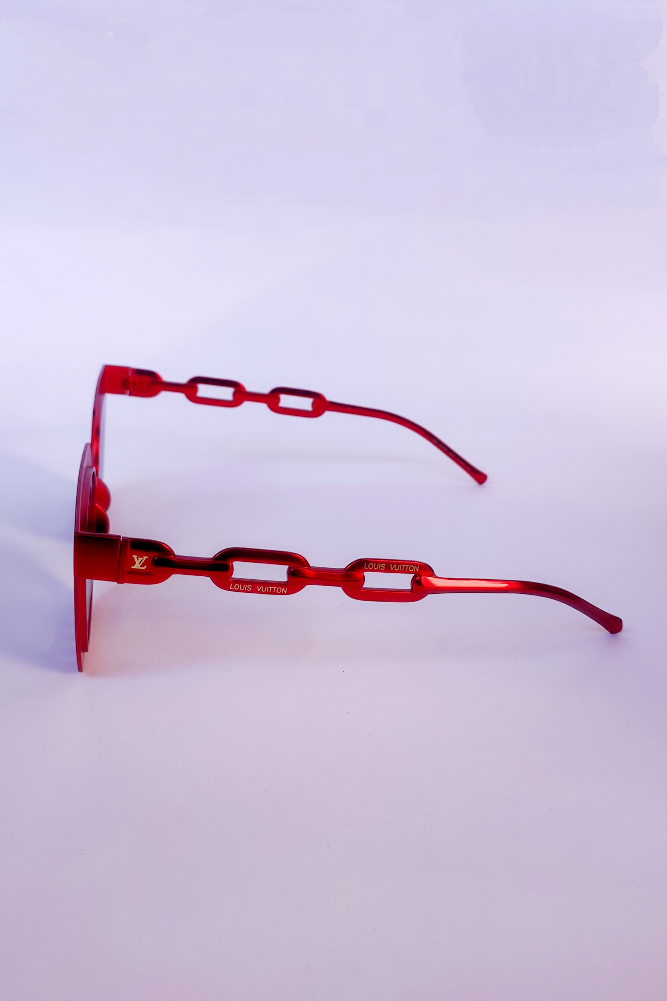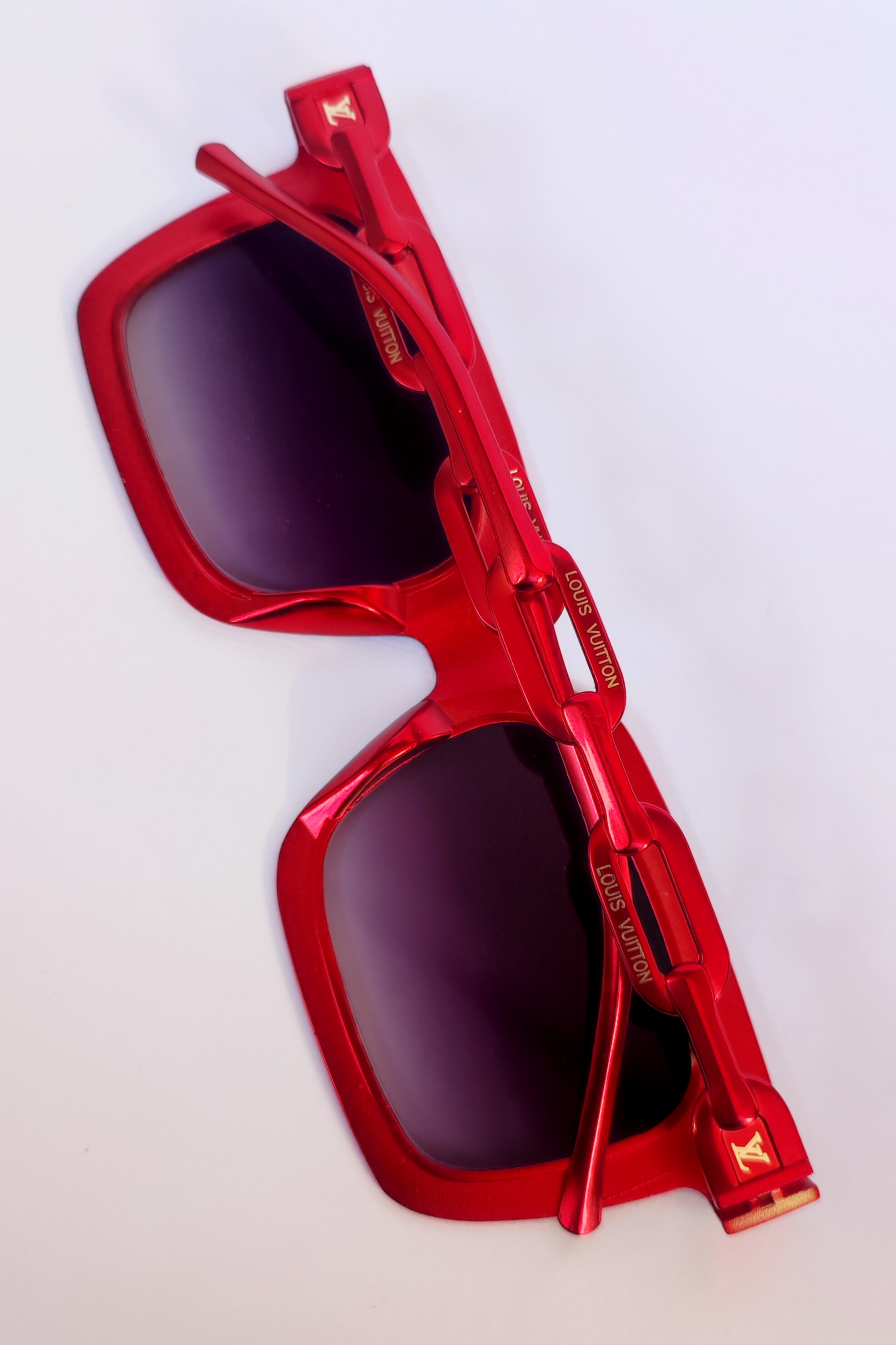 عینک آفتابی لویی ویتون تمام فلز. رنگ متالیک قرمز طلایی لوگودار دسته زنجیری عدسی مستطیل هایلایت فریم فلت