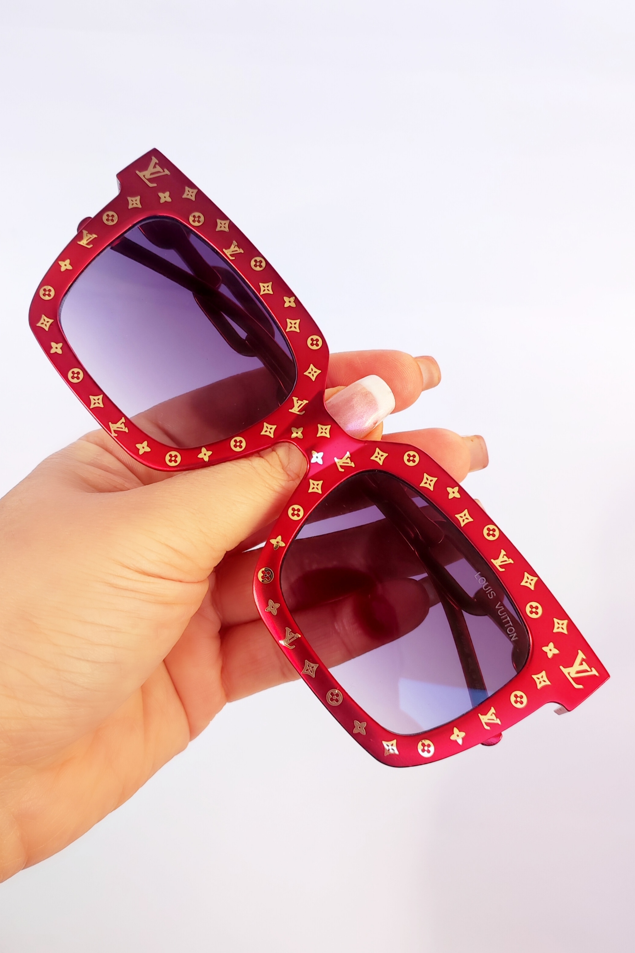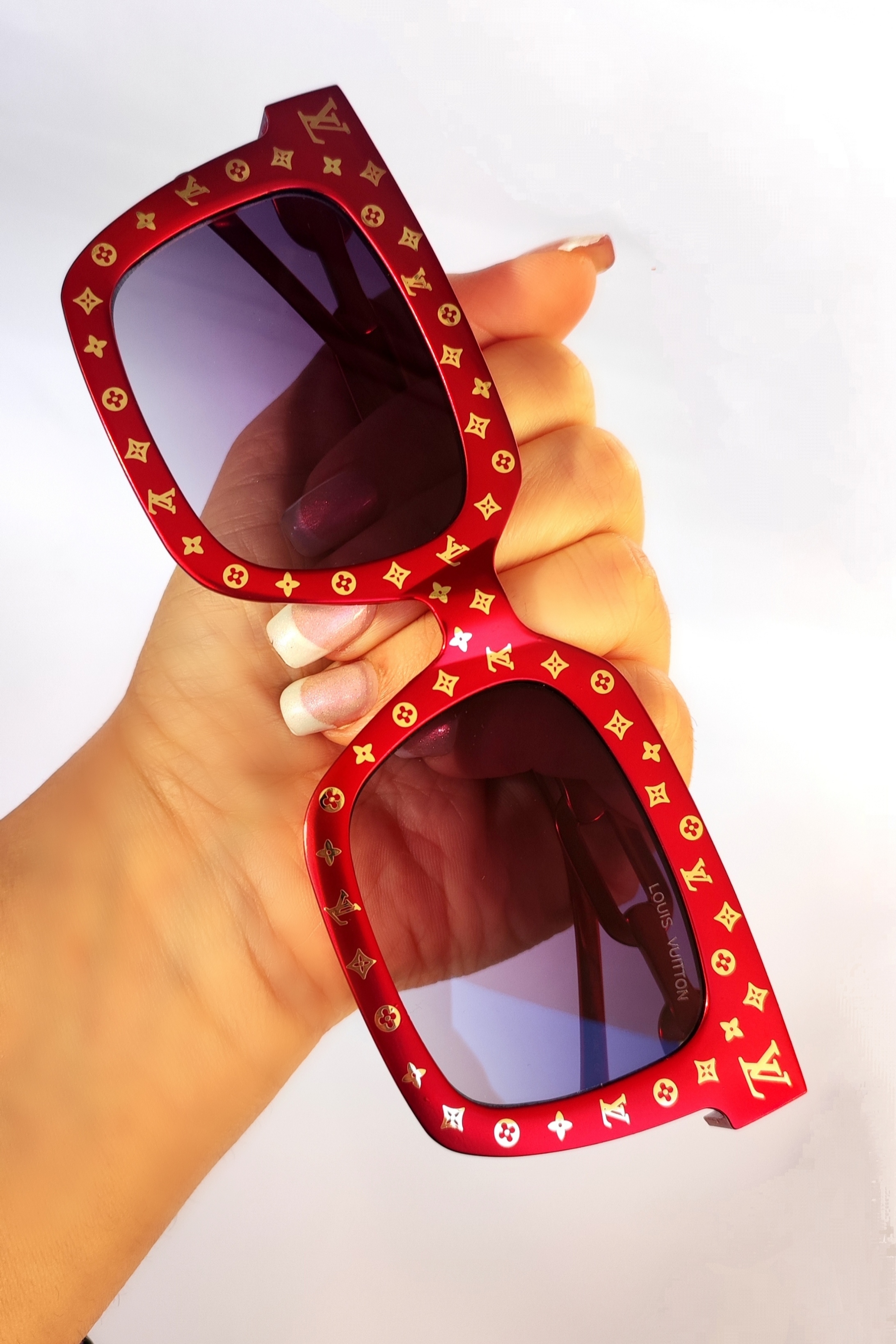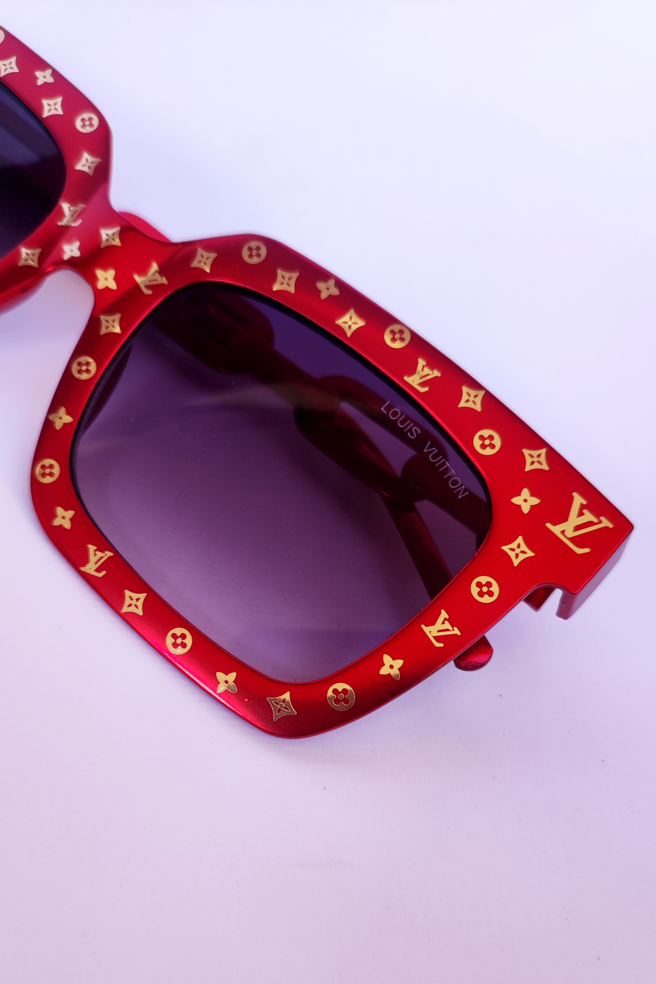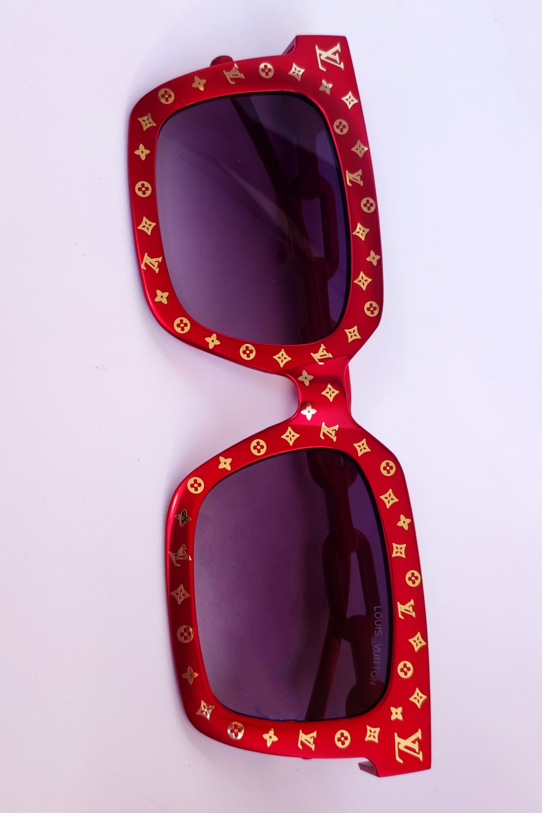 عینک آفتابی لویی ویتون تمام فلز. رنگ متالیک قرمز طلایی لوگودار دسته زنجیری عدسی مستطیل هایلایت فریم فلت